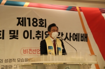 2부 이취임 및 위촉 감사예배는 이동규 목사(부대표, 청주순복음교회)의 인도로 박동찬 목사(부대표, 일산광림교회)가 기도 후 황덕영 목사(부대표, 새중앙교회)가 사도행전 18장 5절부터 11절까지 봉독했다. 서광교회 중창단의 특송 후 최이우 목사(전 대표, 지도위원, 한국복음주의협의회 회장, 종교교회)가 ‘두려워 말고 말하라’는 제목으로 설교했다. 최 목사는 “바울의 선교에는 여러 장애가 있었고, 고린도 지역을 선교할 때 여러 어려움이 있었다. 바울은 잘못된 복음을 전하는 자들과 대결하며 복음을 전했다. 행위를 통해 구원 얻고자 하는 자들에 대해 바울은 오직 믿음을 강조했다”며 “여러 어려움으로 두려워하는 바울에게 주님은 두려워하지 말라고 하셔서 바울은 고린도에 1년 6개월을 머물며 복음을 전했다”면서 “우리가 전할 복음은 오직 예수이다. 코로나로 어려운 상황에 있는 교회에 미래목회포럼이 희망이 되기를 바란다”고 말했다. 이후 ‘한국교회 거룩성 회복과 코로나19 종식을 위해’ 송용현 목사(중앙위원, 안성교회)가, ‘한국교회의 연합과 남북통일을 위해’ 설동주 목사(본부장, 과천약수교회)가, ‘대통령 선거와 사회통합을 위해’ 윤성민 교수(정책자문위원, 강남대학교)가 합심기도했다. 오정호 목사가 “응원을 많이 해주셔서 감사하다. 대선을 앞두고 신자들이 다른 종교 행사에 어디까지 나서야 하는지 포럼을 통해 가이드 라인을 만든 것에 보람을 느낀다. 신임원들이 더 큰 일 감당하기 바란다. 정치적 견해는 달라도 신자로서 중용의 자세를 가져야 한다”며 “모든 것 하나님께 감사한다”고 이임사하고, 정성진 목사가 “신임원들이 잘 해줄 것을 기대하면서 물러나게 되어 감사하다”고 직전 이사장 이임사했다. 이상대 대표가 “모든 순서를 맡아주신 분들에게 감사드린다. 기자들에게도 감사한다. 지난 2년간 코로나로 한국교회가 어려웠다. 이 상황에서 다양한 방법으로 대응했다. 미래목회포럼은 대정부 발언을 여러 차례 했다”며 “다섯 차례의 포럼을 통해 방향제시를 했다. 한국교회의 미래를 고민해야할 때가 되었다”면서도 “2022년을 대비하며 가슴이 띈다. 미래에 소망을 주는 미래목회포럼이 되겠다. 대안과 정답을 제시하는 미래목회포럼이 되겠다. 사회를 향해서도 우리의 목소리를 내겠다. 잘 감당하도록 관심과 기도를 부탁드린다”고 대표 취임인사했다. 박경배 이사장(송촌장로교회)은 “미래목회포럼이 기쁨을 주었다. 귀한 직임을 주셨으니 기대에 맞게 성실히 감당하겠다. 사회의 어려움에 교회도 책임이 있다. 교회가 어려워진 것에는 목회자의 책임이 크다”며 “한국교회에 더 나은 방향을 제시하는 미래목회포럼이 되기를 바란다”고 이사장 취임인사했다. 지형은 목사(기성 총회장, 성락성결교회)가 “미래목회포럼 구성원은 한국교회에 본이 되는 분들이다. 포럼이 살아있는 물을 공급하는 큰 일 감당하시기 바란다. 열정적인 신임 이사장과 대표를 통해 내년도에 많은 일 하시기 부탁드린다”고 축사하고, 김인환 목사(전 대표, 지도위원, 성은교회)가 “연합사업은 미래목회포럼이 처음이었다. 회원들에게 많은 도움을 받았다. 미래목회포럼은 ‘포럼’이기에 학문이며 신학이다. 미래목회포럼은 한국교회의 방향을 제시해줘야 한다”고 축사했다. 이어 김봉준 목사(전 대표, 지도위원, 아홉길사랑교회)가 축하 케익 및 컷팅식을 진행한 후 오정호 목사(직전 대표, 새로남교회)가 축도함으로 감사예배를 마쳤다.