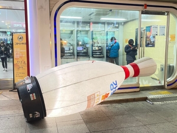 볼링장을 선전하다 매서운 바람에 쓰러졌다.