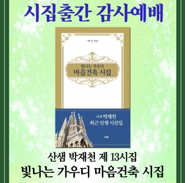 한국문인교회를 섬기며 활발하게 시 저술을 하고 있는 박재천 목사가 13번째 시집 『빛나는 가우디 마음건축 시집』을 출간하고 3월 29일 오후 5시 한국기독교연합회관1308호에서 많은 하객들과 함께 감사예배를 드렸다.